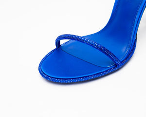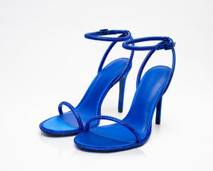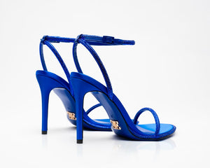 ESTÉA in Azuri ist eine kraftvolle Neuinterpretation des klassischen Stilettos – gefertigt aus leuchtendem 100 % Seidensatin und veredelt mit funkelnden Kristallriemen, die bei jeder Bewegung das Licht einfangen.